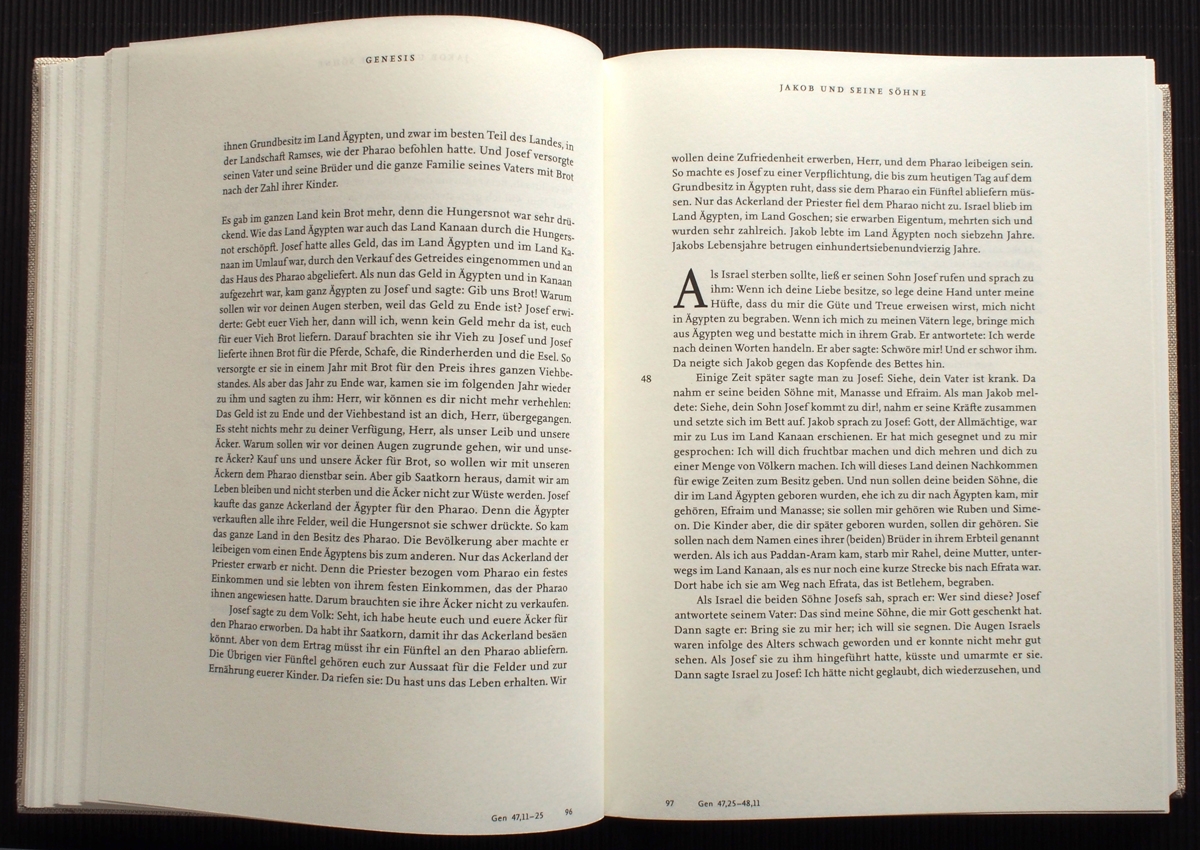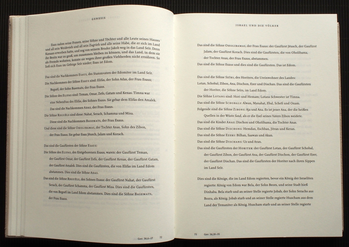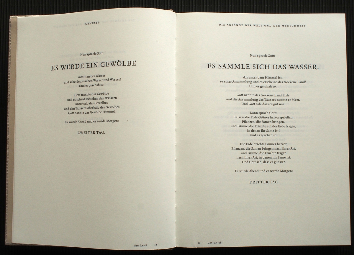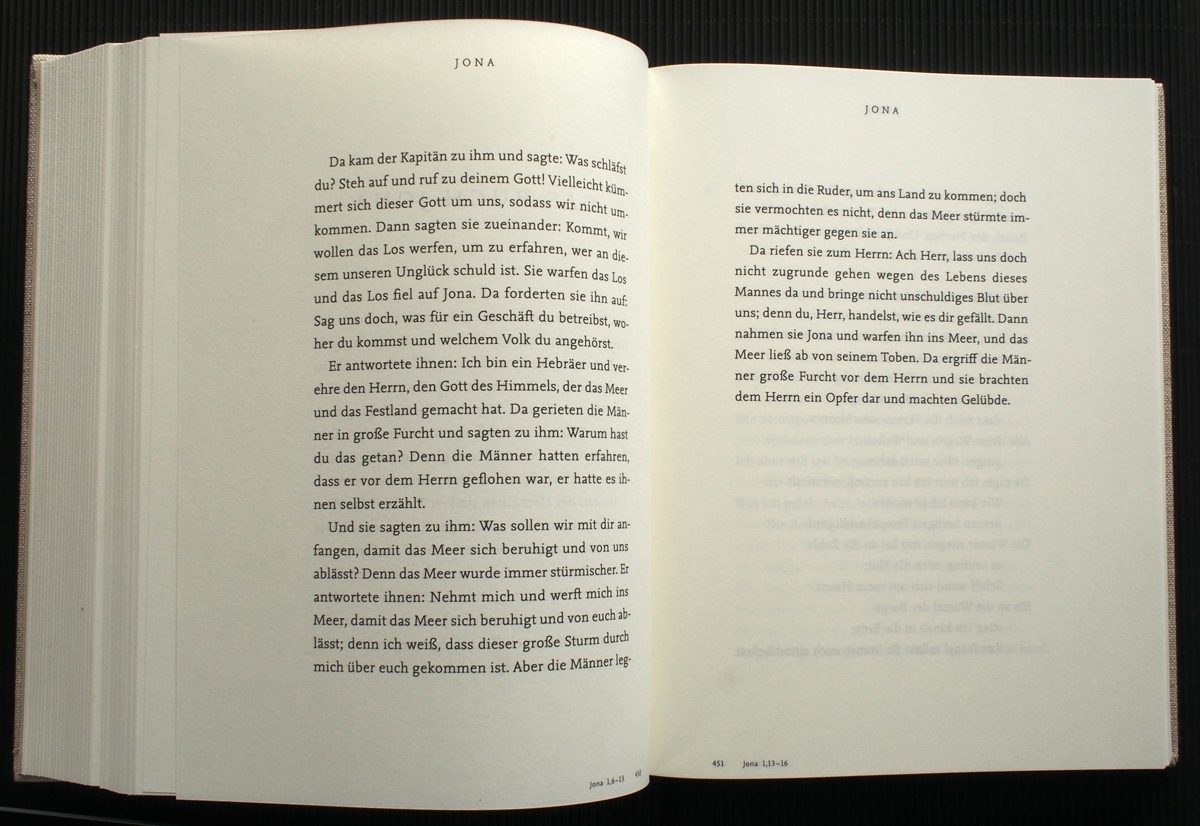 »Die heilige Schrift in lesefreundlicher Form« – in Broschüren und im Nachwert eine markante Spur zu großspurig formuliert – für das Exterieur dieser Bibelausgabe mag ich das ganz und gar gelten lassen. Aber ich vermisse dabei die Demut vor der Geschichte der Buchherstellung und Typografie: Viele haben bereits großartiges geleistet, mit dem Rohr, der Feder, dem Blei. Mag im modernen Bibeldruck auch das meiste verschütt gegangen sein, es geht schlicht nicht um Neuerfindung sondern um Anschluss an die alte Schwarze Kunst. Geschenkt.