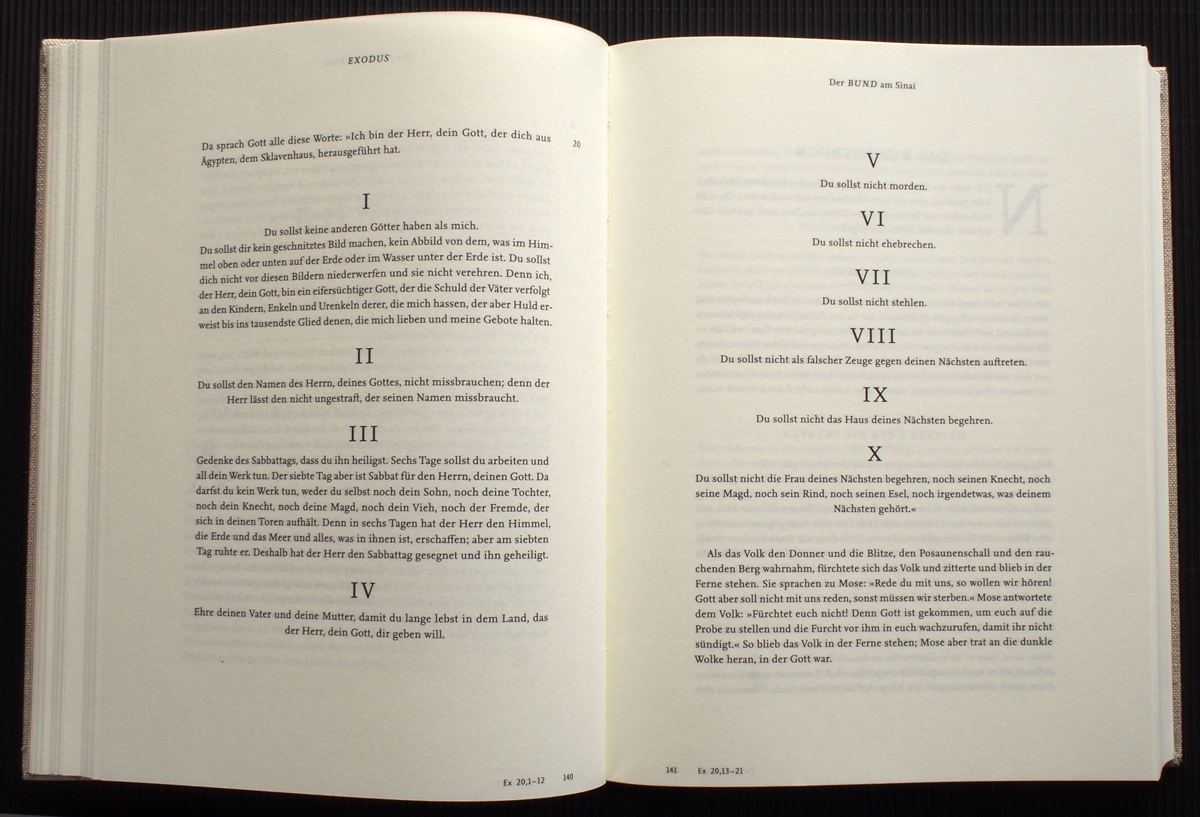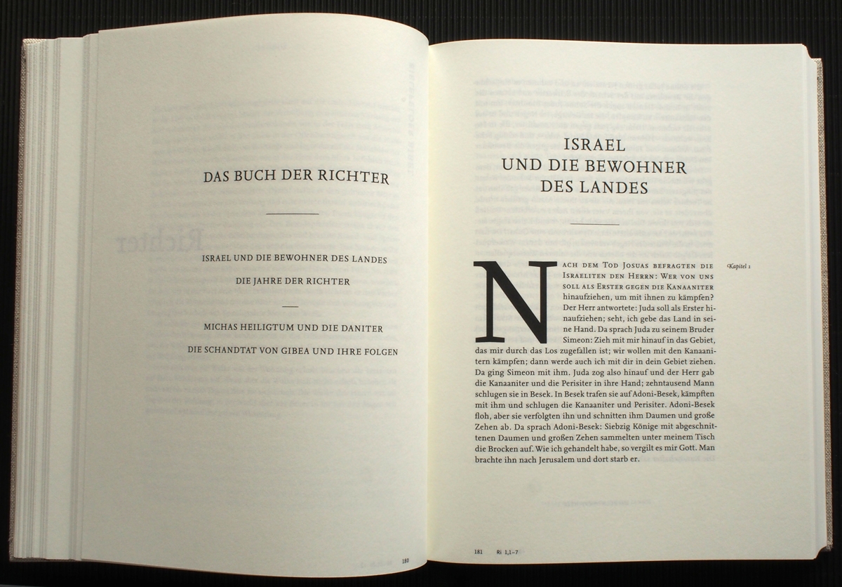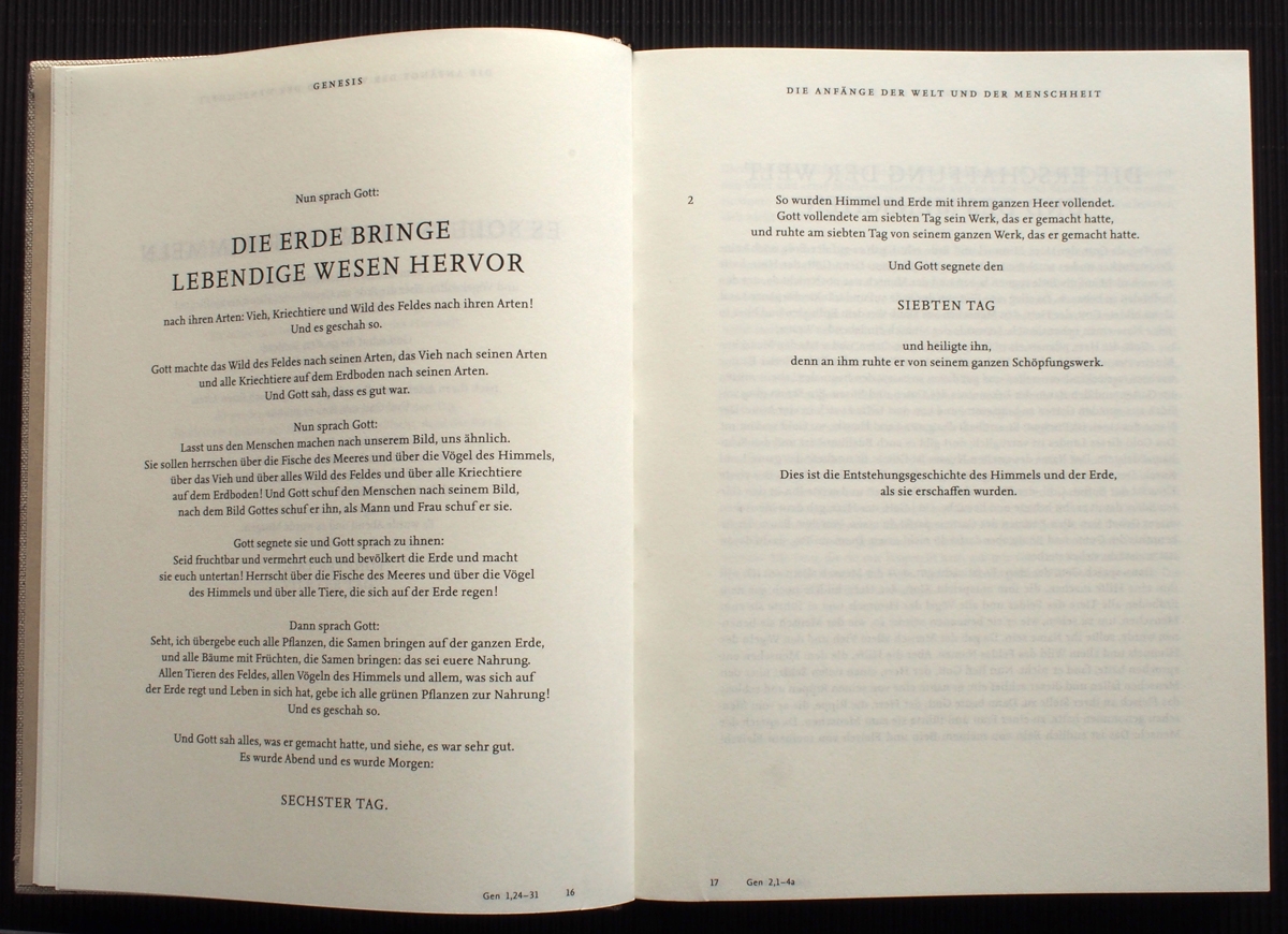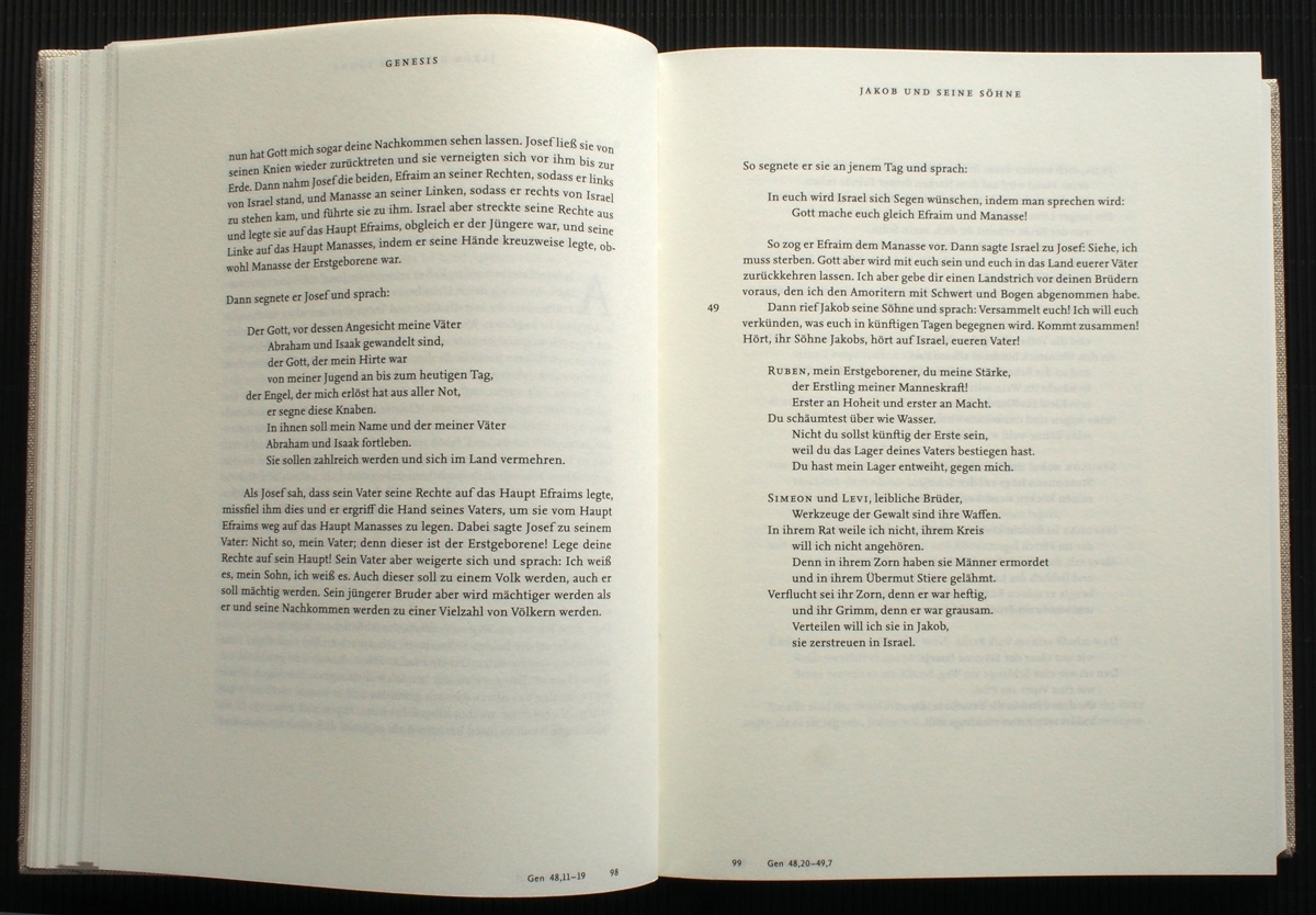 »Die heilige Schrift in lesefreundlicher Form« – in Broschüren und im Nachwert eine markante Spur zu großspurig formuliert – für das Exterieur dieser Bibelausgabe mag ich das ganz und gar gelten lassen. Aber ich vermisse dabei die Demut vor der Geschichte der Buchherstellung und Typografie: Viele haben bereits großartiges geleistet, mit dem Rohr, der Feder, dem Blei. Mag im modernen Bibeldruck auch das meiste verschütt gegangen sein, es geht schlicht nicht um Neuerfindung sondern um Anschluss an die alte Schwarze Kunst. Geschenkt.