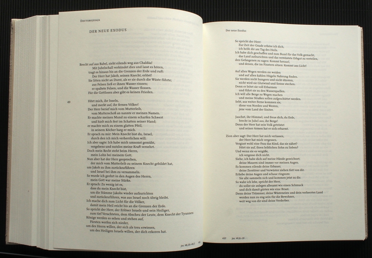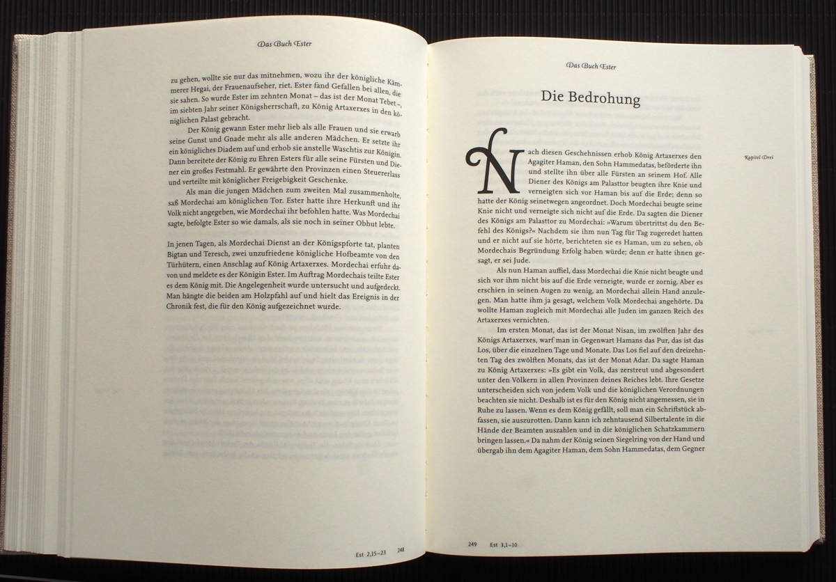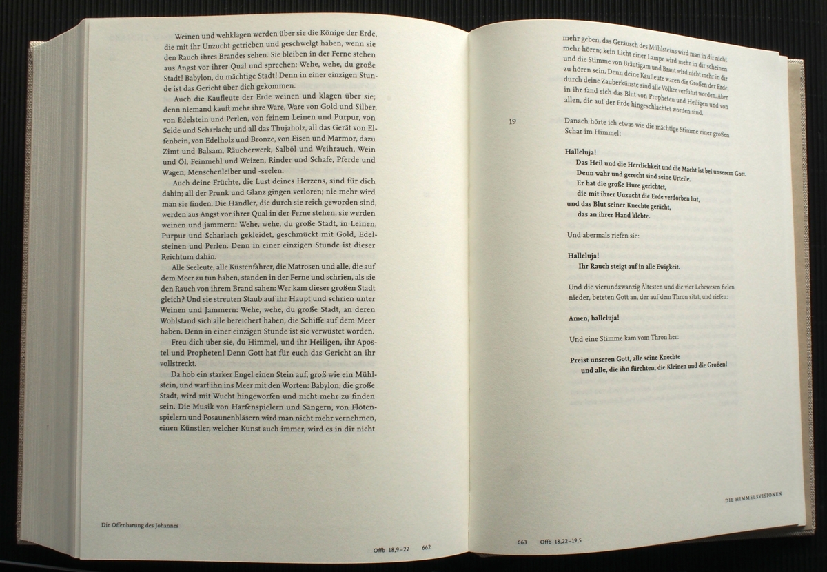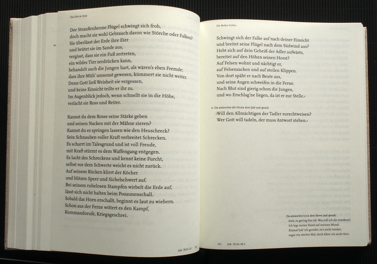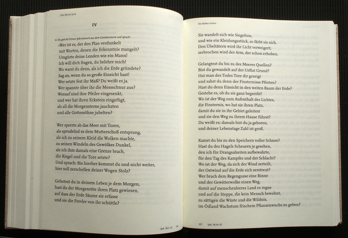 Das Buch Ijob/Hiob mit seinen langen Überlegungen ist interessant in korrespondierenden gegeneinander versetzten Spalten gesetzt. So ist das durchaus gut. Aber als Gott anfängt zu sprechen, wird sein Text in mehr als doppelter Schriftgröße gesetzt. Theaterdonner quasi. (Bildfolge 16, 17, 18)