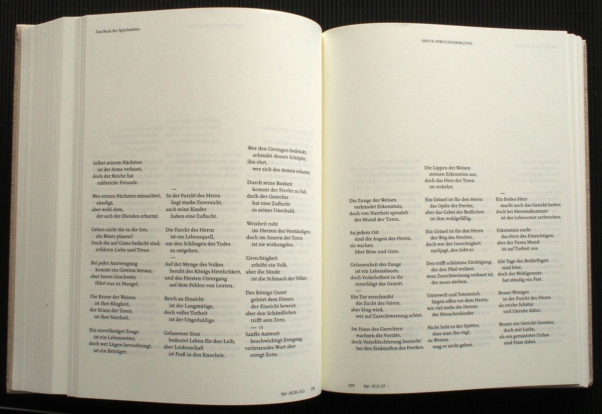 Die Suche nach einer qualitativ ausgezeichneten heutigen Bibeltypografie ist noch nicht abgeschlossen. Danke aber dennoch für (mindestens) vier Sachen: Den Satz der Psalmen, die Sprichwörter und die Bergpredigt. Und vor allem: Für die Zurücknahme der Ziffern und nicht-originalen Texte.