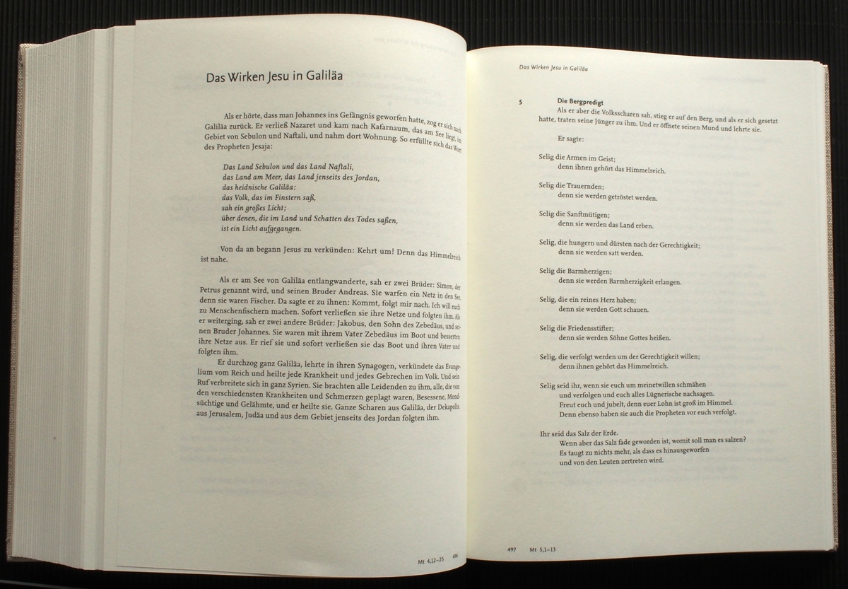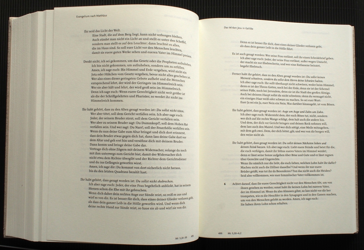 Danach geht es wieder normal weiter. Geradezu ein Aha-Erlebnis ist für mich der Satz der Bergpredigt: Typografisch mit hängendem Einzug wird die Zusammenstellung verschiedener kurzer Redeeinheiten so überzeugend markiert, dass die sonst üblichen (sekundären!) Überschriften gar nicht fehlen. Im Gegenteil: Ich will solche nie wieder sehen, sie zerlegen den Text. Hier bleibt er bestehen. (Bild 27, 28)
