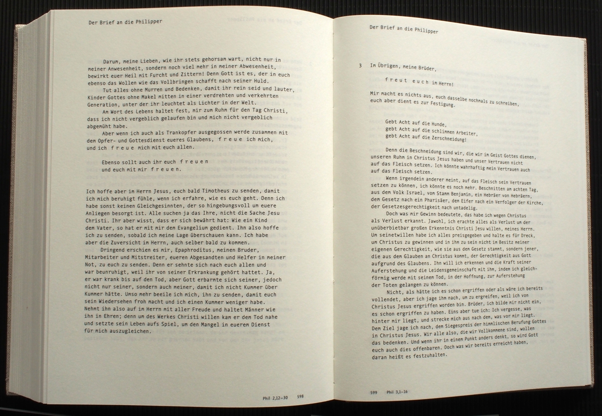 Die Typografie sollte sich generell nicht vor ihren Text stellen, sondern ihm dienen und sich selbst nach Möglichkeit unsichtbar machen. So wie das schon mit den Ziffern der Verse und Kapitel geschehen ist. Insofern ist die Bielefelder Bibel nach wie vor ein schönes Buch, auch ein beeindruckendes Werk typografischer Möglichkeiten, aber nur bedingt tauglich als Muster für lesefreundliche Bibeln.