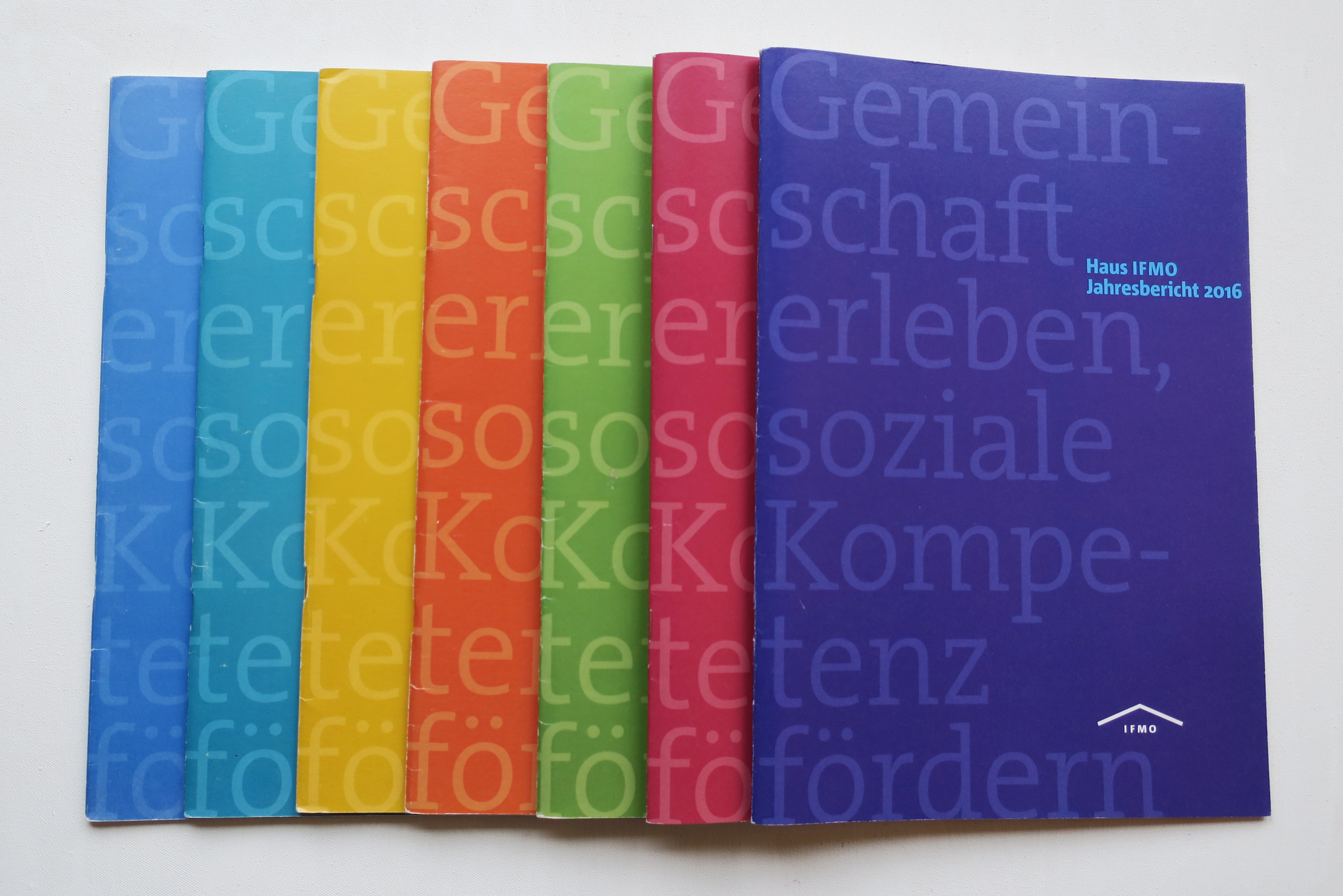 Bereits als präzise Schriftsetzerin kam Waltraud Hofbauer 1992/1993 ins Seminar. Ein Beispiel von ihr ist der Jahresbericht für das Haus IFMO, Initiative für Menschen ohne Obdach e.V. in einer kostengünstigen kleinen Auflage im Digitaldruck produziert. Gesetzt aus der Thesis Serif und der Corpid von Lucas de Groot in Hofbauers äußerst exakter Satzarbeit (Mikrotypografie gilt hier wirklich etwas!). Beispiele von 2010 bis 2016 mit Fotos der Hausbewohner in Freizeitaktivitäten.