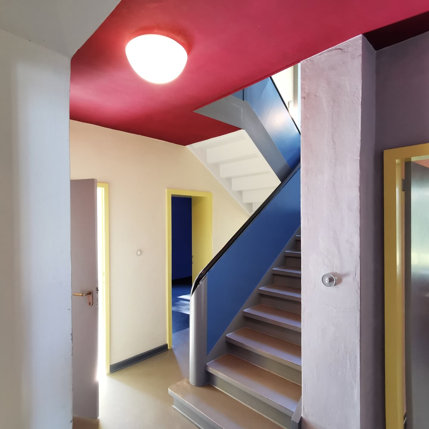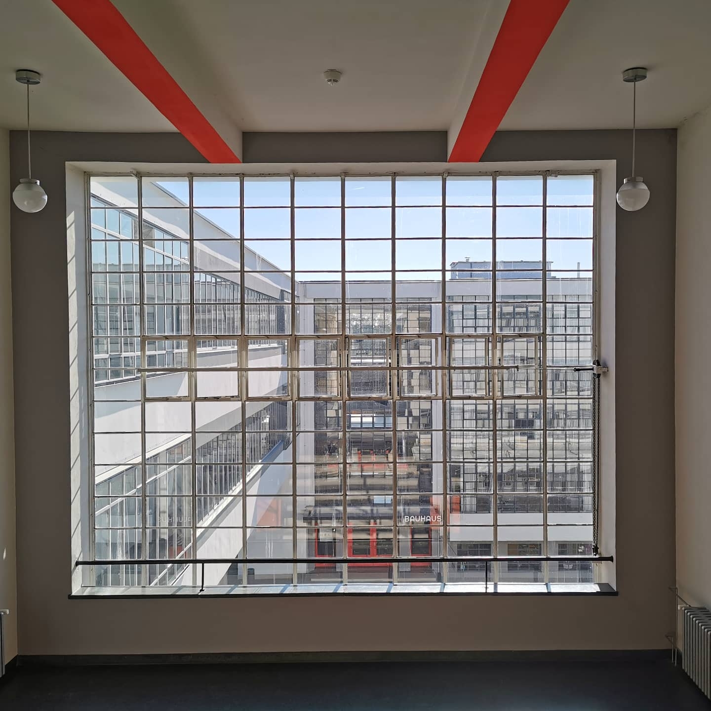 Das Herbstwetter zeigt sich weiterhin so klar wie das Bauhaus, sodass ich das Frühstück ausfallen lasse und einen Spaziergang zum Kornhaus mache. Ich möchte es unbedingt nochmal bei Tag sehen – mitsamt seinem traditionsreichen Kiosk, in dem müde Wanderer sich jahrzehntelang mit Bockwurst und Brause stärken konnten. Später entdecke ich auf dem Weg ein unscheinbares Haus, im dem Walter Gropius eine Zeitlang wohnte. Dann zur letzten gemeinsamen Station – den Meisterhäusern. Erneut eine begeisterte Führerin, die nicht nur spannend erzählt, sondern mit ihrer offen geäußerten Meinung Haltung beweist. Auch hier überkommt mich immer wieder ein seltsames Gefühl. Wie nenne ich es? Vielleicht Erhabenheit? In dem Raum zu stehen, in dem Kandinsky gewohnt und den er aus Sicht von Walter Gropius mit seinem plüschigen Sofa so verschandelt hatte, dass seine Innenräume auf keinem der PR-Fotos zu sehen waren. Oder im Atelier zu sitzen, in dem Paul Klee gemalt hat, im Winter (wie alle anderen) auch mit kaltgefrorenen Fingern – die Häuser waren zwar sehr modern und komfortabel, allerdings nicht sonderlich gut isoliert. Auch hier: So viele Blickachsen, die mich immer aufs Neue dazu inspirieren, genau hinzuschauen und zu fotografieren.