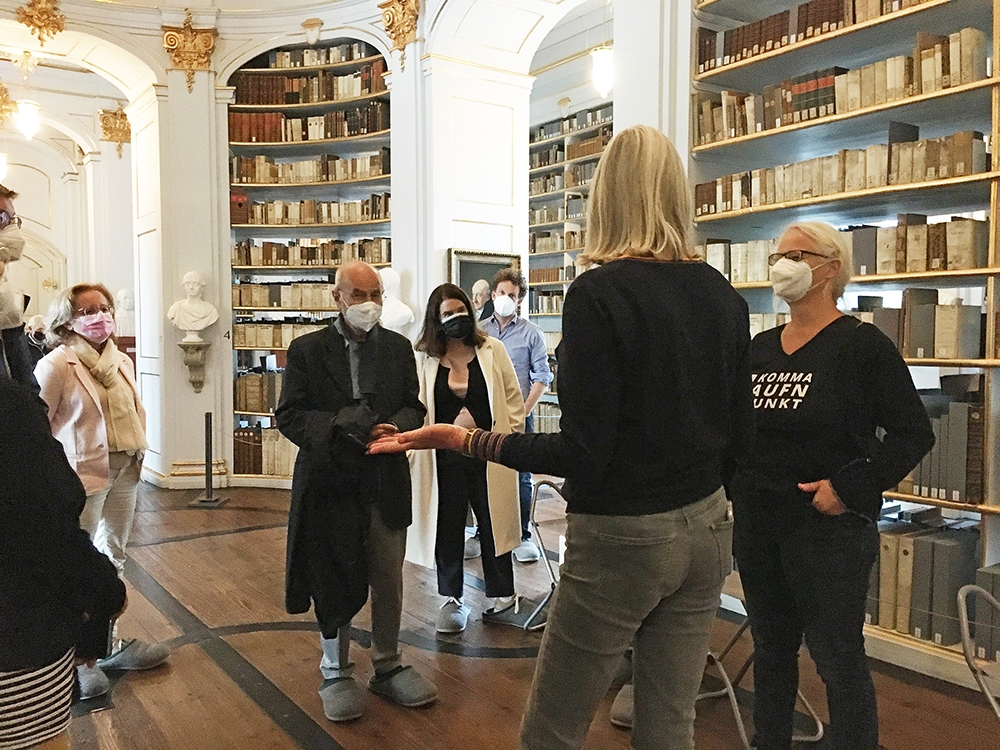 Pünktlich um 17.00 Uhr treffen wir uns alle in der Herzogin-Amalia-Bibliothek. Auch hier geleitet uns eine kompetente Dame durch die Räume – die alten wie auch die neuen. Von dem verheerenden Brand 2004 sieht man auf den ersten Blick nichts mehr. Unvorstellbar: Mehr als 50.000 Bücher waren den Flammen zum Opfer gefallen, über 100.000 teilweise so schwer geschädigt, dass sie kaum reparabel waren. Die Geschichten, die wir hören, gehen zu Herzen. Stellen Sie sich vor, Sie müssen sich für zwei ihrer Kinder entscheiden und die anderen den Flammen überlassen. Genau das passierte dem damaligen Leiter – er durfte eines, der Feuerwehrmann ein zweites Buch auf dem Armen durch die Flammen nach außen tragen. Ich kann mir nicht vorstellen, wie es ist, als Buchliebhaber sich für die beiden wertvollsten Werke der Sammlung entscheiden zu müssen. Aber auch schöne Geschichten gibt es zu hören. So ist als Folge des Brandes eine riesige Expertise zur Bücherrestauration entstanden – die heute weltweit zum Einsatz kommt. Unterirdisch geht es zu den neuen Leseräumen, mit wunderbarer Atmosphäre.