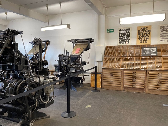 Nach dem Frühstück bringt uns der Zug nach Leipzig. Das Programm ist wieder sportlich. Erste Station: das Schrift und Buchmuseum. Auch hier werden wir wieder sehr herzlich empfangen und kompetent durch die Räumlichkeiten geführt. Die Ausstellungsräume, der Lesesaal, hinüber vom modernen Trakt in den alten Teil und dann hinab in das Kellergeschoss – wir kommen kaum zum Verschnaufen. Ich weiß gar nicht, wo ich zuerst hingucken soll, alles ist so voller Geschichten und Geschichte. Die Mittagspause wird sehr knapp, weil wir alle noch gern das Angebot annehmen, in der wunderbaren Sammlung von Schriftmusterbüchern zu stöbern. Da lacht das Typograf:innenherz. Ich bin sehr berührt von der Umsichtigkeit, uns diesen Leckerbissen zu servieren.