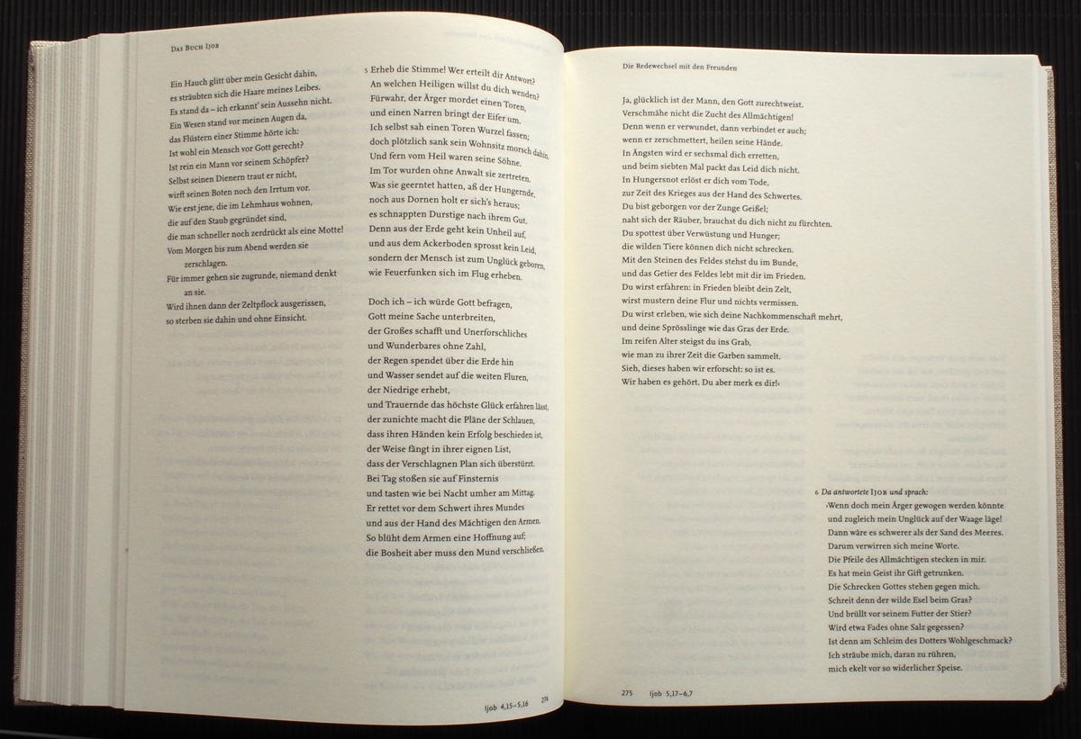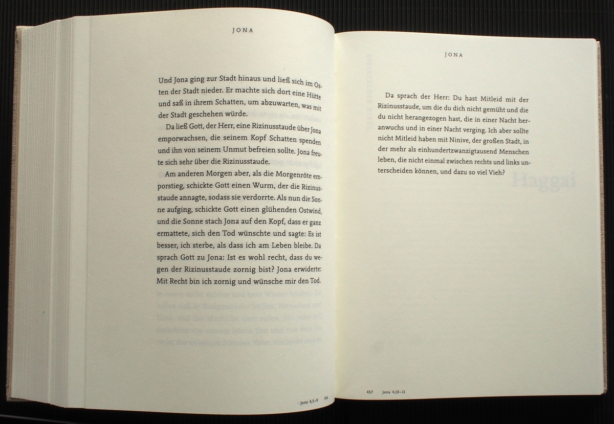 Das Buch Ijob/Hiob mit seinen langen Überlegungen ist interessant in korrespondierenden gegeneinander versetzten Spalten gesetzt. So ist das durchaus gut. Aber als Gott anfängt zu sprechen, wird sein Text in mehr als doppelter Schriftgröße gesetzt. Theaterdonner quasi. (Bildfolge 16, 17, 18)