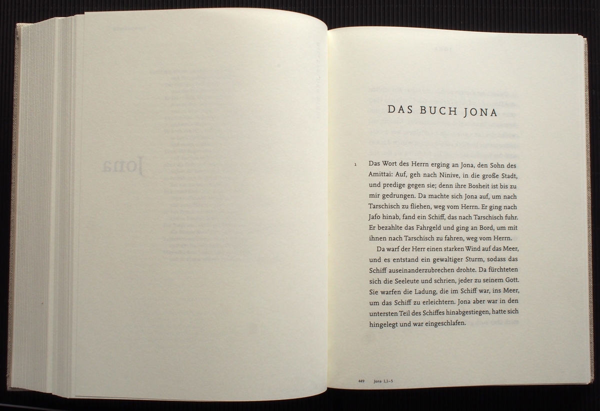 Eine erste Irritation trifft mich auf Seite 449 (von 688): Das Buch Jona. Ich habe plötzlich ein anderes Buch vor mir. Jona ist gesetzt wie ein Kinderbuch: In großer Schrift mit riesigem Durchschuss. Ich fange geradezu das Buchstabieren an. Mir fällt eines meiner ersten Kinderlesebücher ein. (Bild 23)